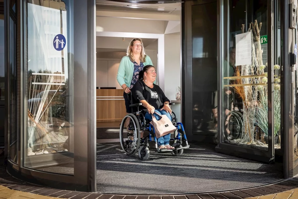 Er staan rolwagens ter beschikking aan het onthaal om patiënten met een mobiliteitsbeperking te begeleiden naar hun (zieken)wagen.