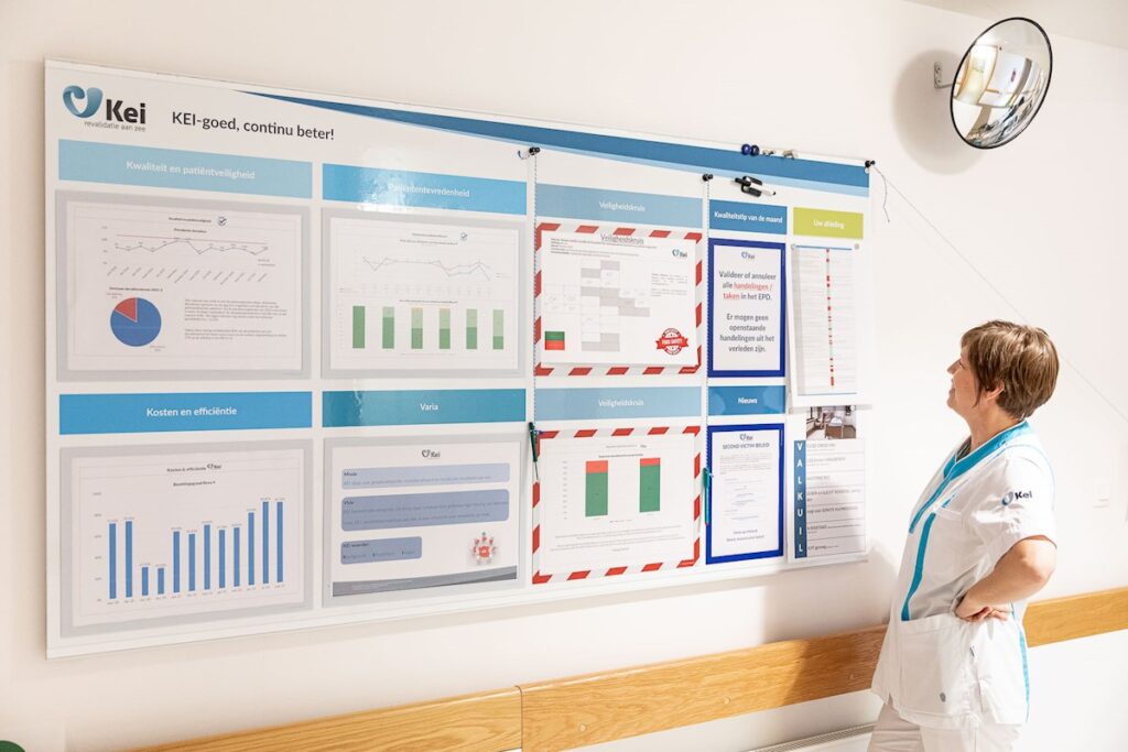 Tevens wordt minstens maandelijks een bordmeeting vanuit de dienst kwaliteit voorzien waarbij we alle medewerkers van de Reva-afdeling samen brengen rond het kwaliteitsbord om indicatoren en verbeteracties te bespreken.